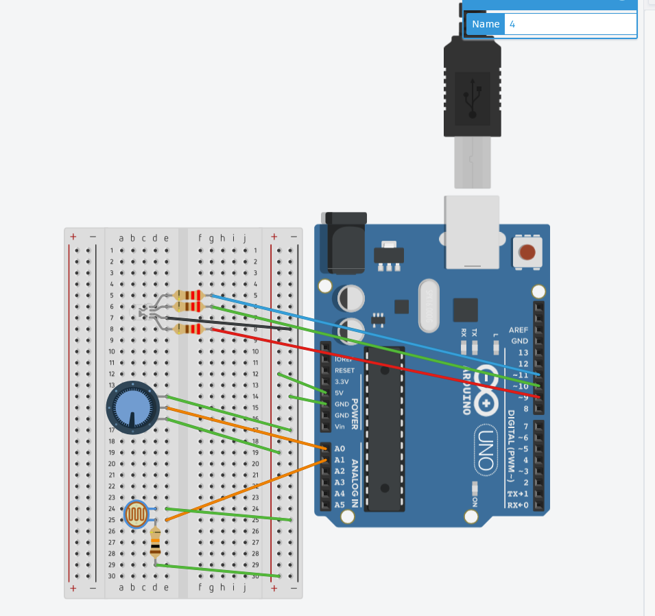 - RGB LED Подключён к 11, 10 и 9 разъёму, соединён 3 резисторами и подключён напрямую к минусу