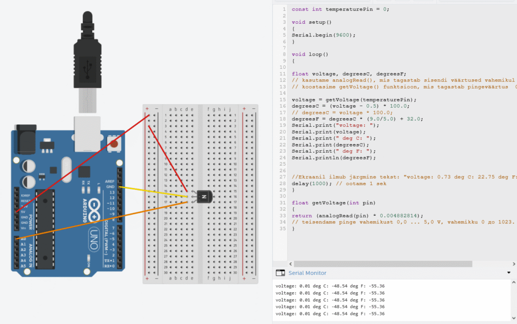 Katse temperatuuri mõõtmiseks temperatuurianduri abil.