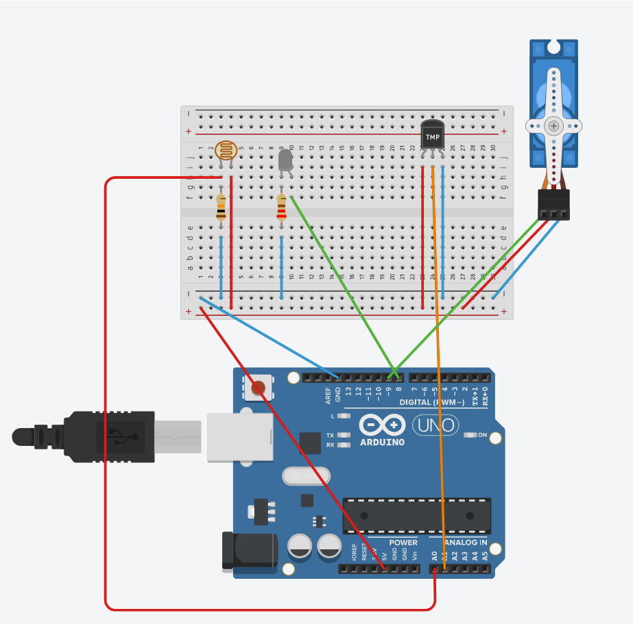 Система должна быть способна приводить в действие серводвигатель в зависимости от изменения температуры и включать или выключать освещение в зависимости от интенсивности света с помощью фотопроводника.