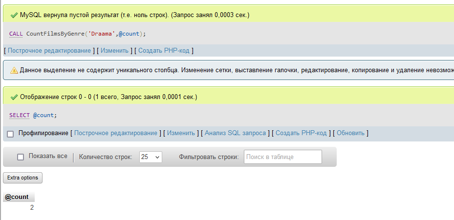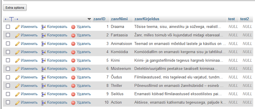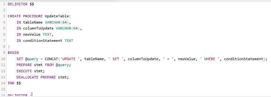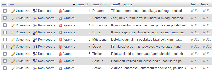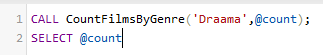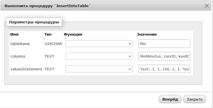 SET @p0=’film’; SET @p1=’filmNimetus, zanrID, keelID, pikkus, rezisorID, filmtypeID, reklaam’; SET @p2=’\’test\’, 1, 1, 100, 1, 1, \’test\”; CALL `InsertIntoTable`(@p0, @p1, @p2);