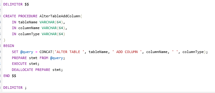 SET @p0=’add’; SET @p1=’zanr’; SET @p2=’test’; SET @p3=’int’; CALL `alter_table`(@p0, @p1, @p2, @p3);