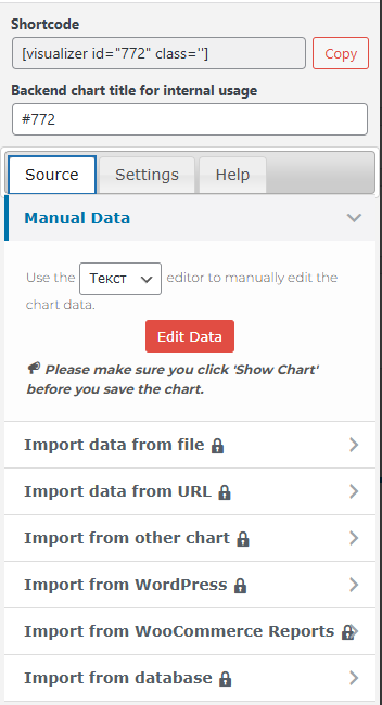 Для вставки на страницу нам показывает шорткод, также мы можем импортировать данные разными способами, в случае если у нас есть PRO версия: